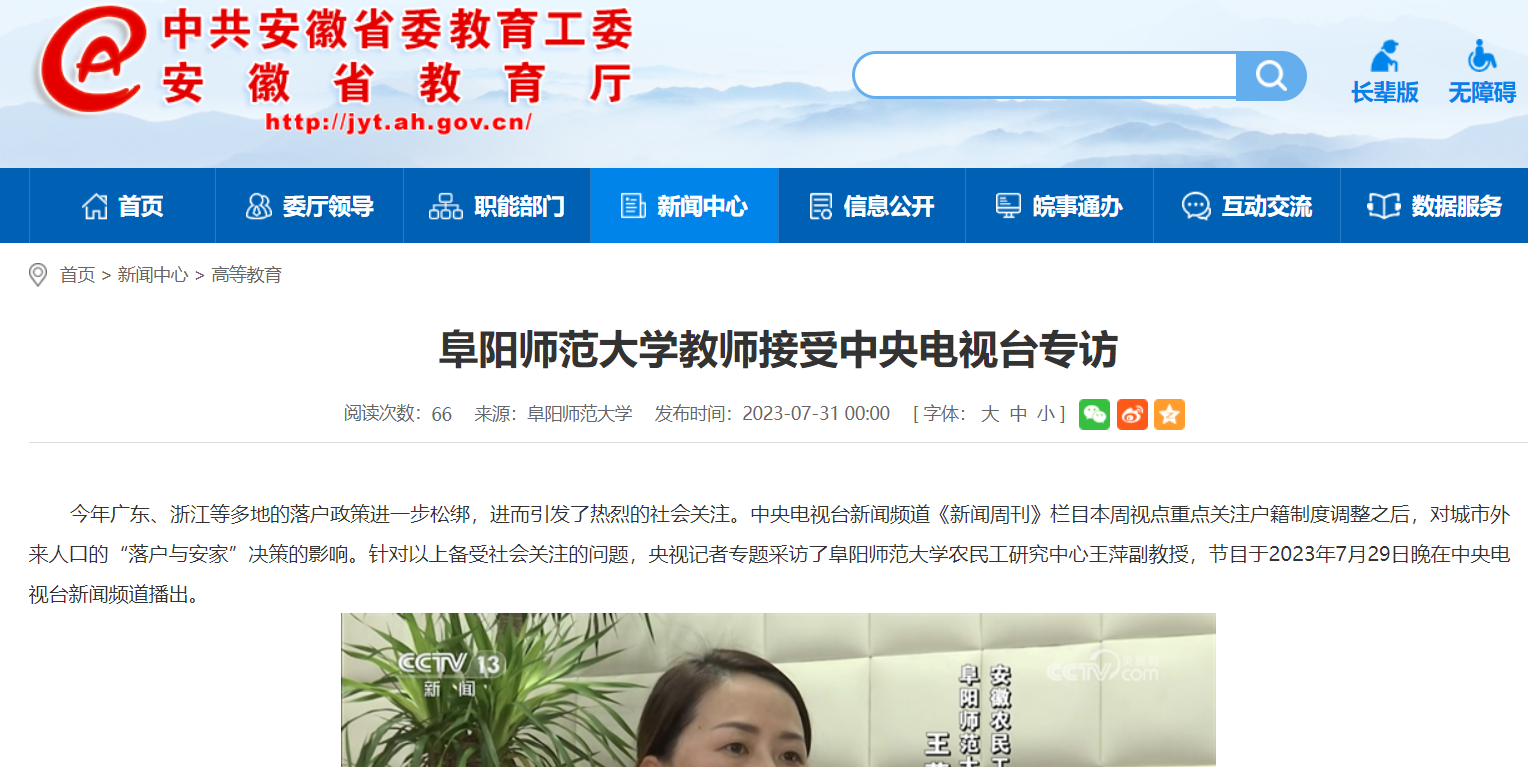 7月31日,安徽教育网报道:阜阳师范大学教师接受中央电视台专访。文章地址: