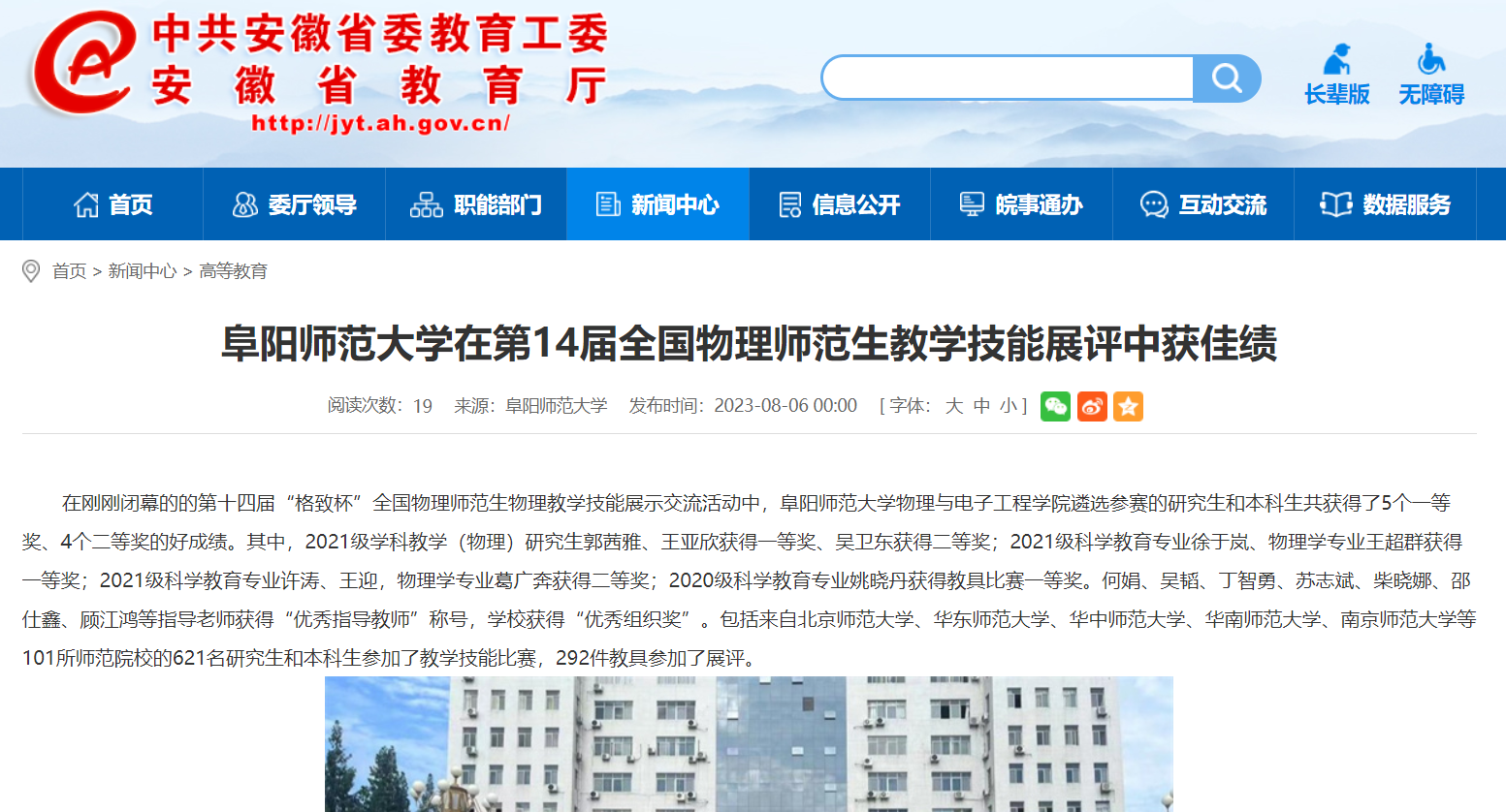 8月06日,安徽教育网报道:阜阳师范大学在第14届全国物理师范生教学技能展评中获佳绩。文章地址:
