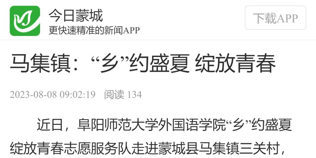 8月08日,蒙城广播电视台融媒体中心报道:马集镇:“乡”约盛夏 绽放青春。文章地址:http://share.plus.ahmctv.net/2023-08-08/49Kc6vWAZhmnMrTq.html?_hgOutLink=news/NewsDetail&id=64673