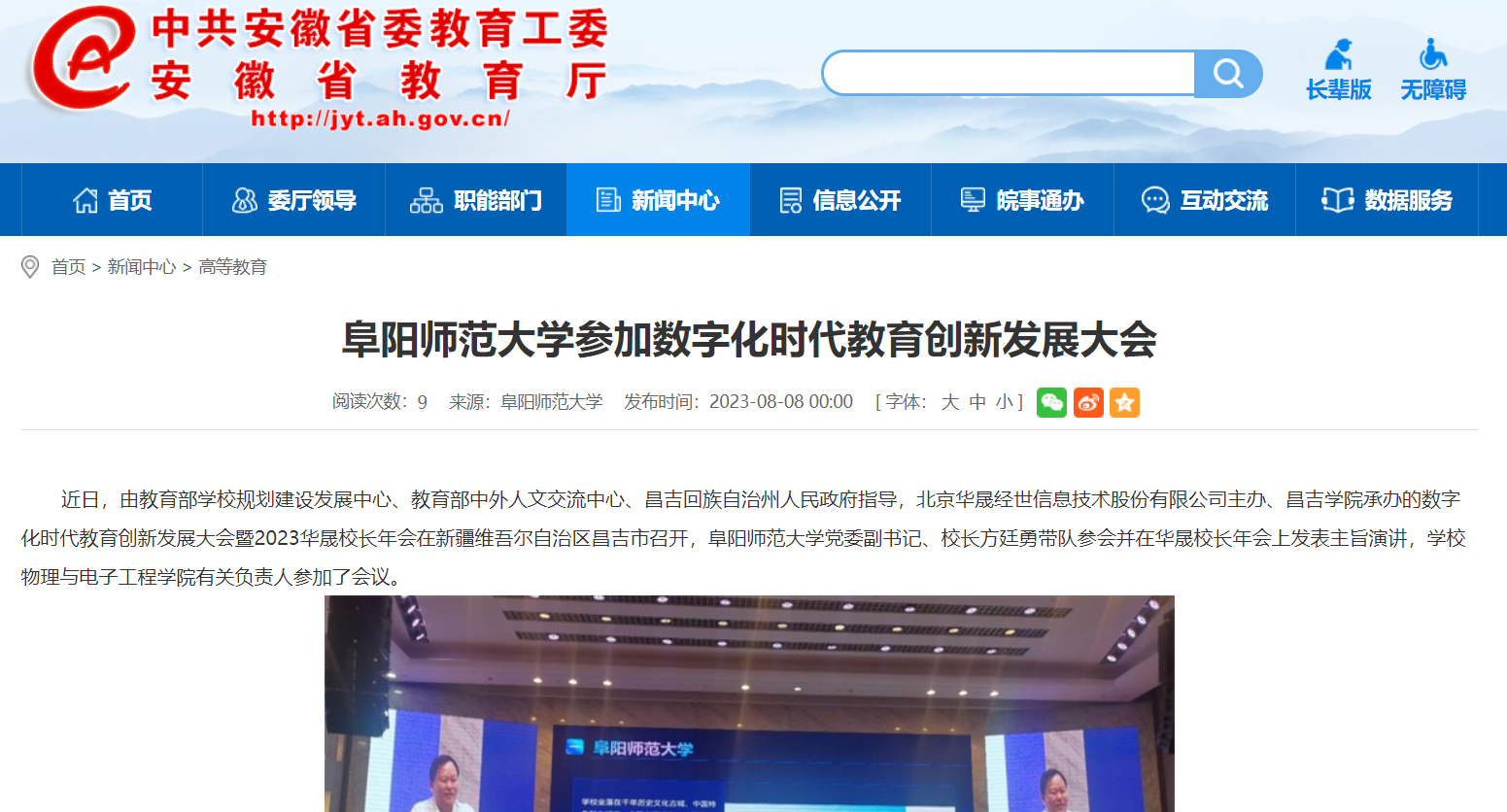8月08日,安徽教育网报道:阜阳师范大学参加数字化时代教育创新发展大会。文章地址: