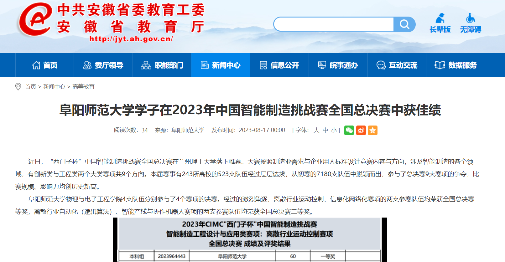 8月17日,安徽教育网报道:阜阳师范大学学子在2023年中国智能制造挑战赛全国总决赛中获佳绩。文章地址: