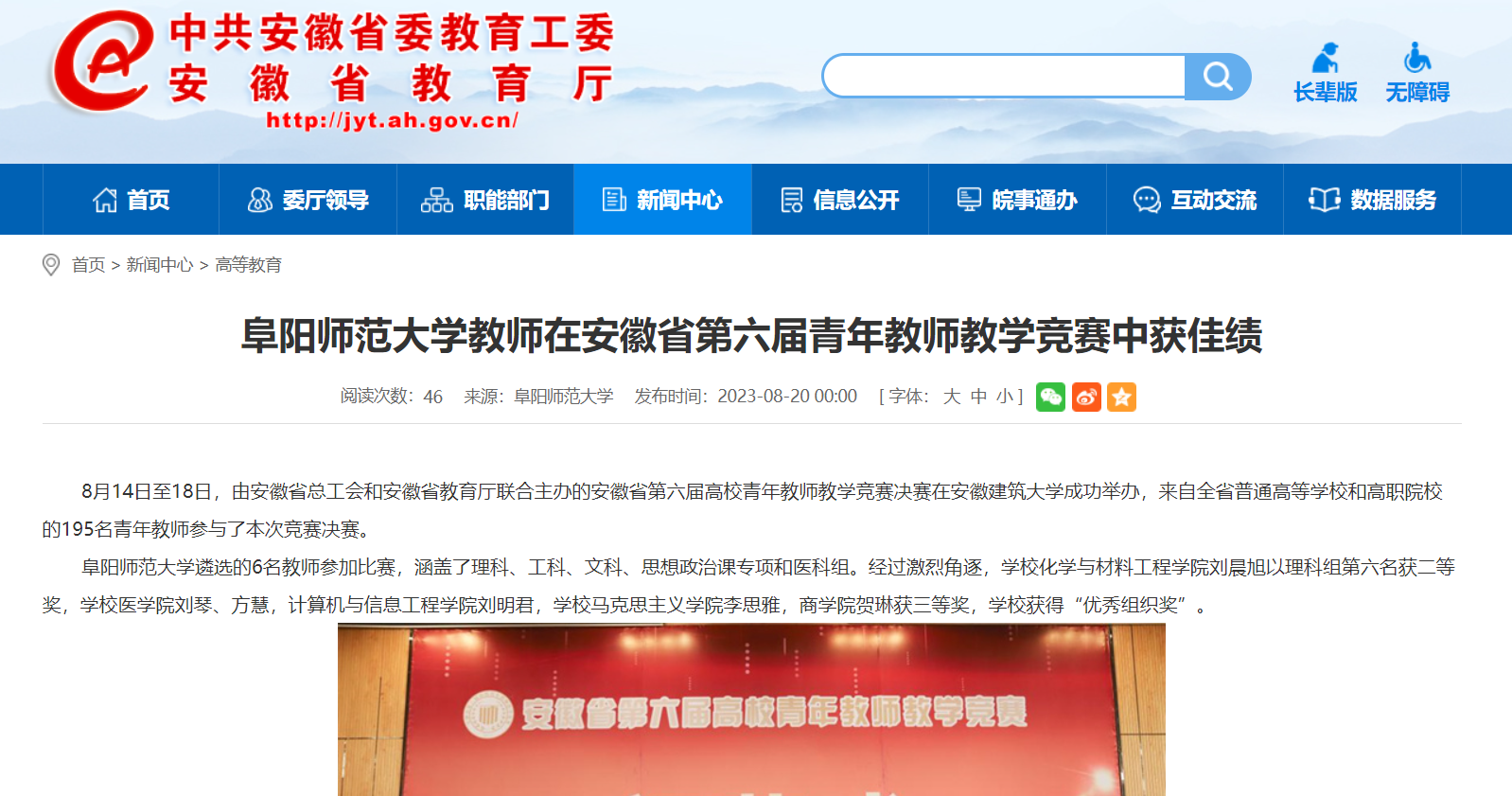 安徽教育网报道:阜阳师范大学教师在安徽省第六届青年教师教学竞赛中获佳绩