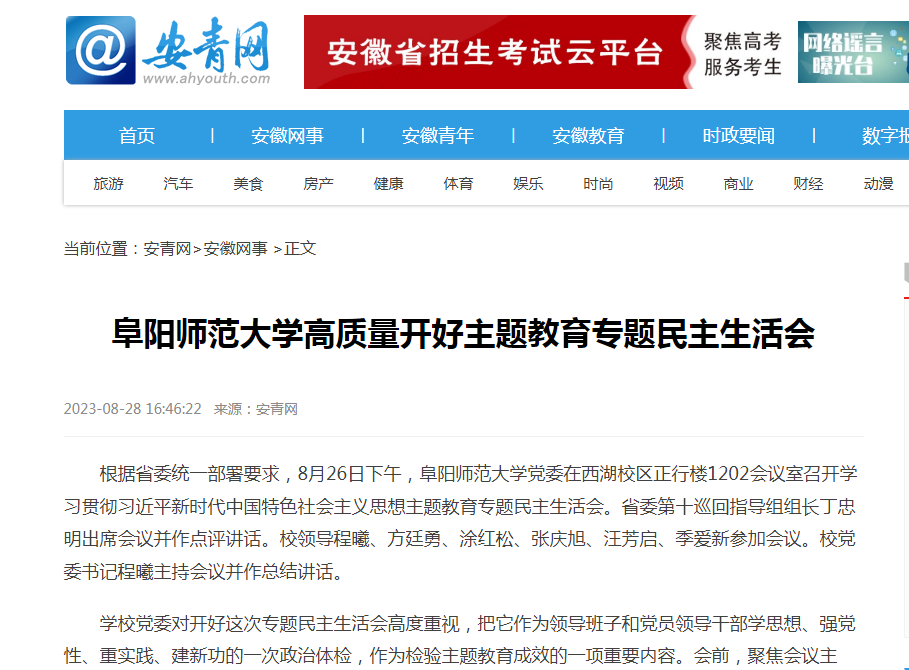 安青网报道:阜阳师范大学高质量开好主题教育专题民主生活会