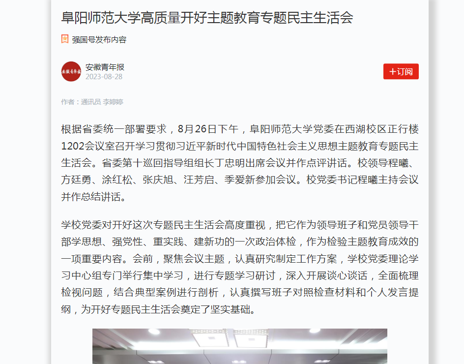 8月28日,“学习强国”安徽青年报平台报道:阜阳师范大学高质量开好主题教育专题民主生活会。文章地址:https://article.xuexi.cn/articles/index.html?art_id=12896844369143323278&source=share&study_style_id=feeds_opaque&reco_id=10250ad45cc2c0a822350015&share_to=wx_single&study_share_enable=1&study_comment_disable=0&ptype=0&item_id=12896844369143323278