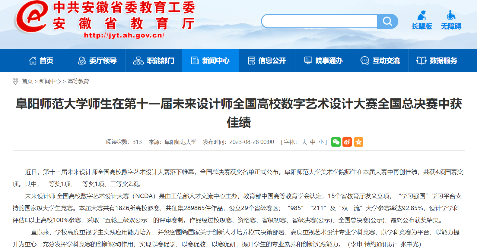 8月28日,安徽教育网报道:阜阳师范大学师生在第十一届未来设计师全国高校数字艺术设计大赛全国总决赛中获佳绩。文章地址:http://jyt.ah.gov.cn/xwzx/gdjy/40667952.html