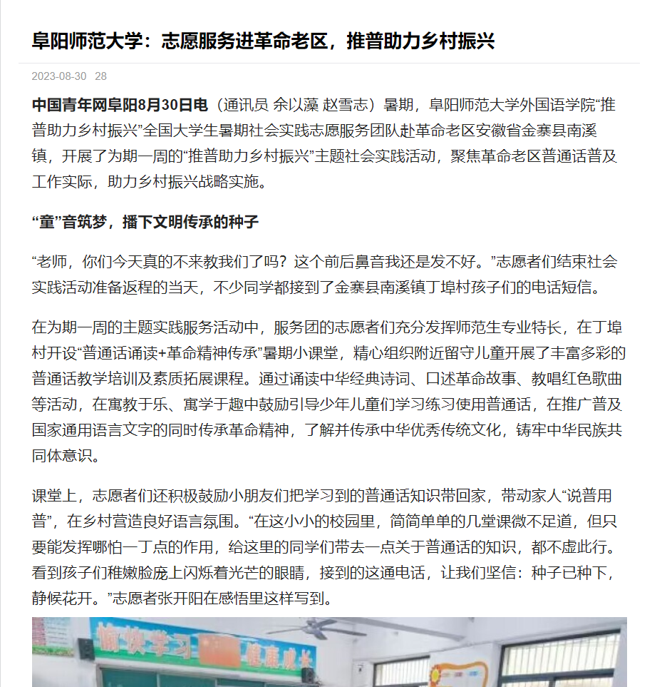 8月30日,中国青年网报道:阜阳师范大学:志愿服务进革命老区,推普助力乡村振兴。文章地址:https://xiaoyuan.cycnet.com.cn/s?uid=4700116&app_version=1.4.9&sid=1586555&time=1693378107&signature=ml3Q0RNe9oPxVZ6pJMA7EZW3qcrem6DaL2XGkOKdvDynjYb5Wz&sign=e881afd187d81b1bb4a404b866fa0926