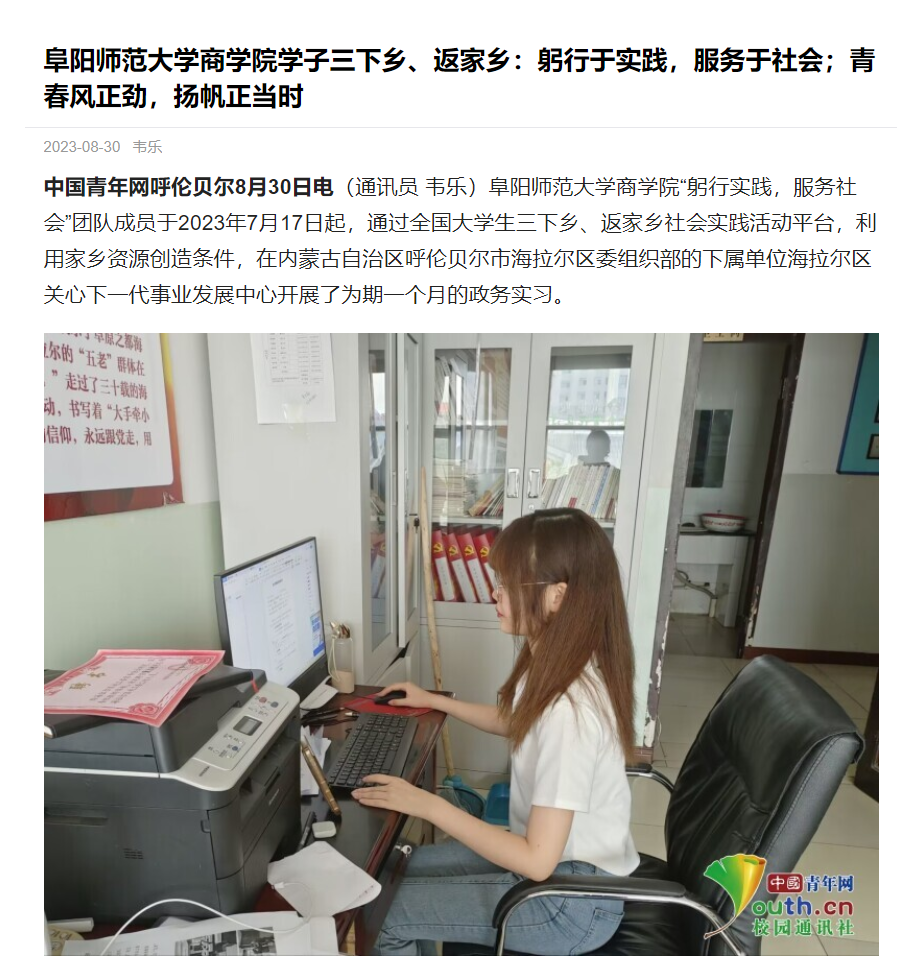 8月30日,中国青年网报道:阜阳师范大学商学院学子三下乡、返家乡:躬行于实践,服务于社会;青春风正劲,扬帆正当时。文章地址:https://xiaoyuan.cycnet.com.cn/s?uid=7527216&app_version=1.4.9&sid=1587342&time=1693389497&signature=Mvg9Vr5WAX3dJejlq6GaJZWDeHGWr5kawoYk2PpNxbRZEDzmnL&sign=d2340f60a33c9f40f74e464a4400aaaa