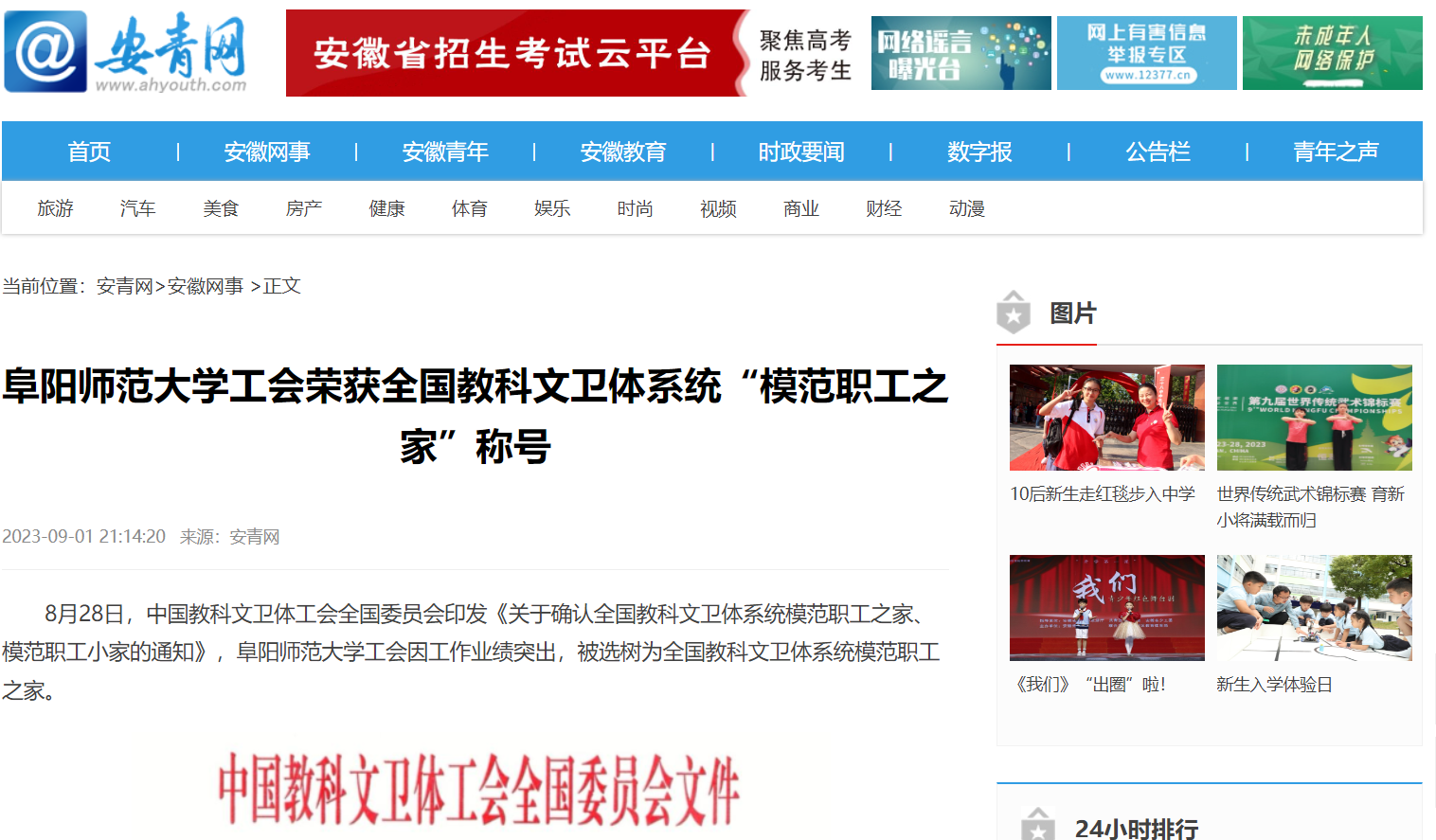 9月01日,安青网报道:阜阳师范大学工会荣获全国教科文卫体系统“模范职工之家”称号。文章地址: