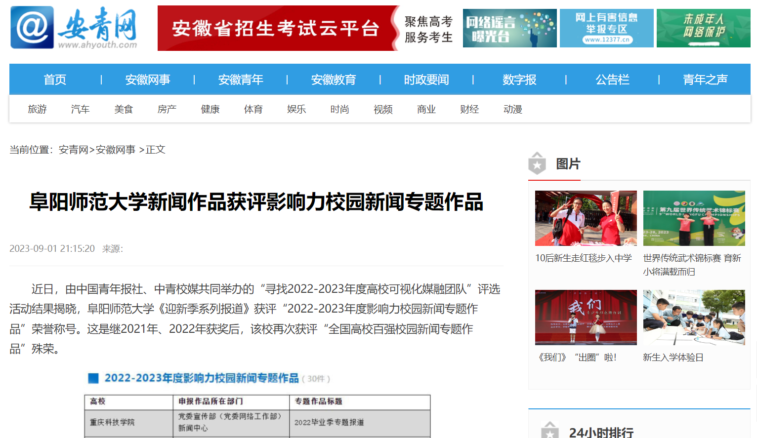 9月01日,安青网报道:阜阳师范大学新闻作品获评影响力校园新闻专题作品。文章地址: