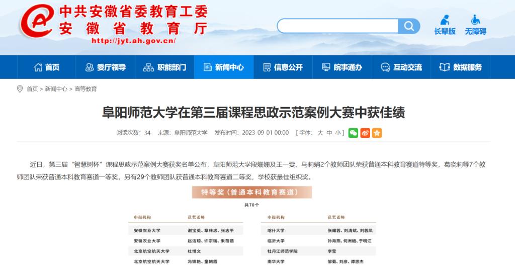 9月01日,安徽教育网报道:阜阳师范大学在第三届课程思政示范案例大赛中获佳绩。文章地址: