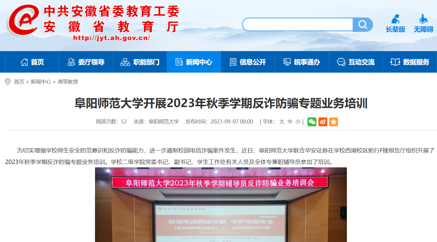 安徽教育网报道:阜阳师范大学开展2023年秋季学期反诈防骗专题业务培训