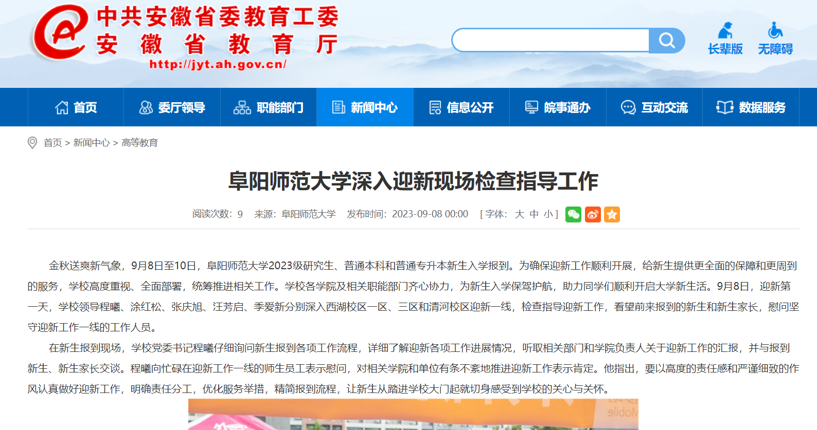 9月08日,安徽教育网报道:阜阳师范大学深入迎新现场检查指导工作。文章地址: