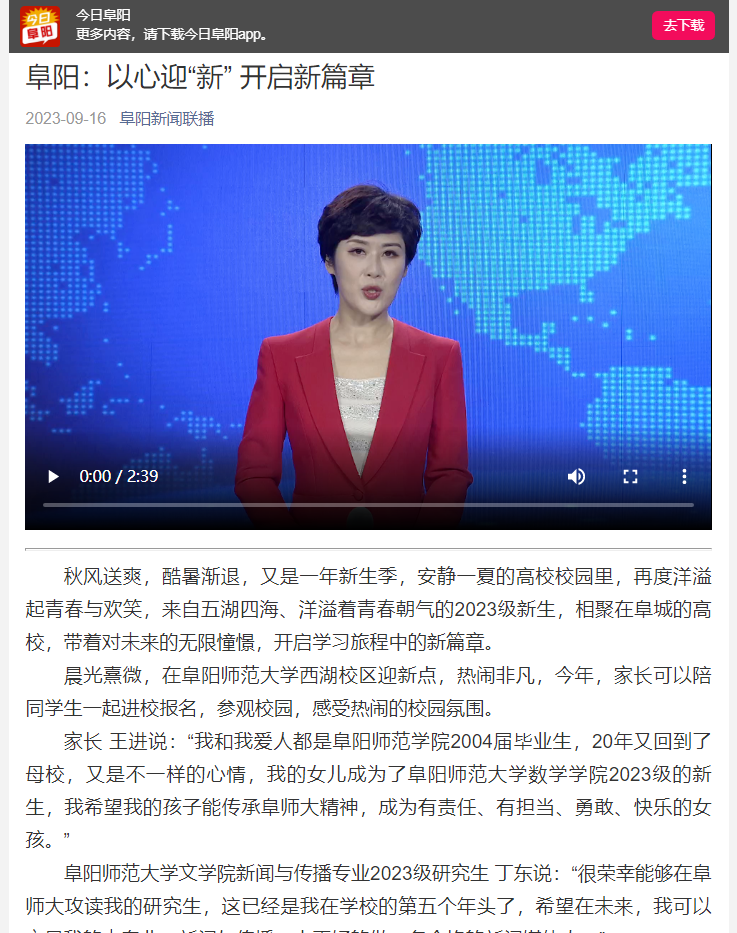 9月16日,阜阳新闻联播报道:阜阳师范大学一篆刻作品入选全国高等院校篆刻教学成果展。文章地址:https://wxfx.fyosys.com/mag/info/v1/info/wapInfoView?id=304013&themecolor=f30c5c&p_u=778