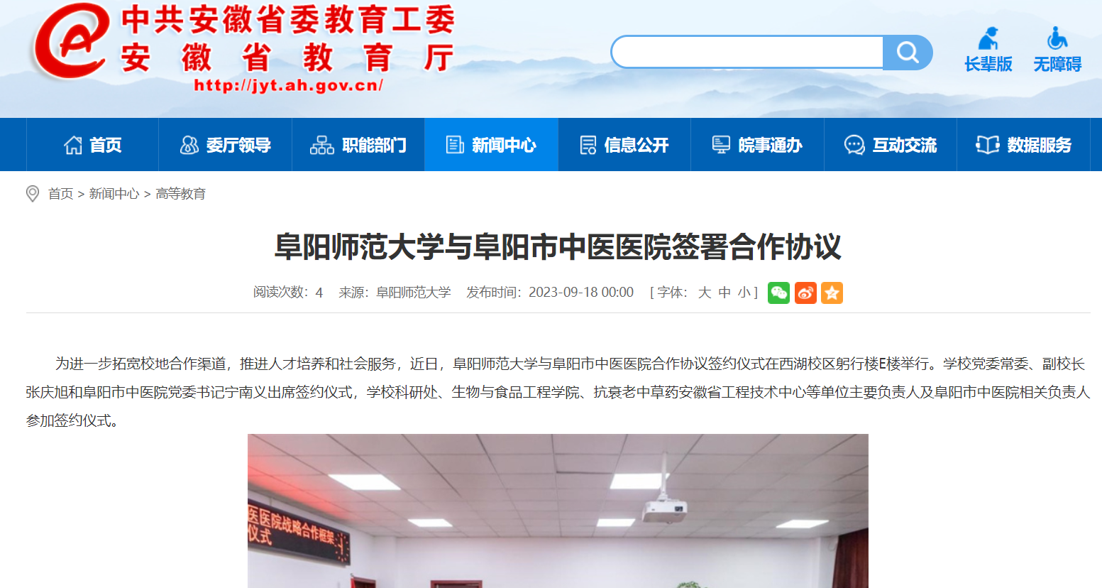 9月18日,安徽教育网报道:阜阳师范大学与阜阳市中医医院签署合作协议。文章地址: