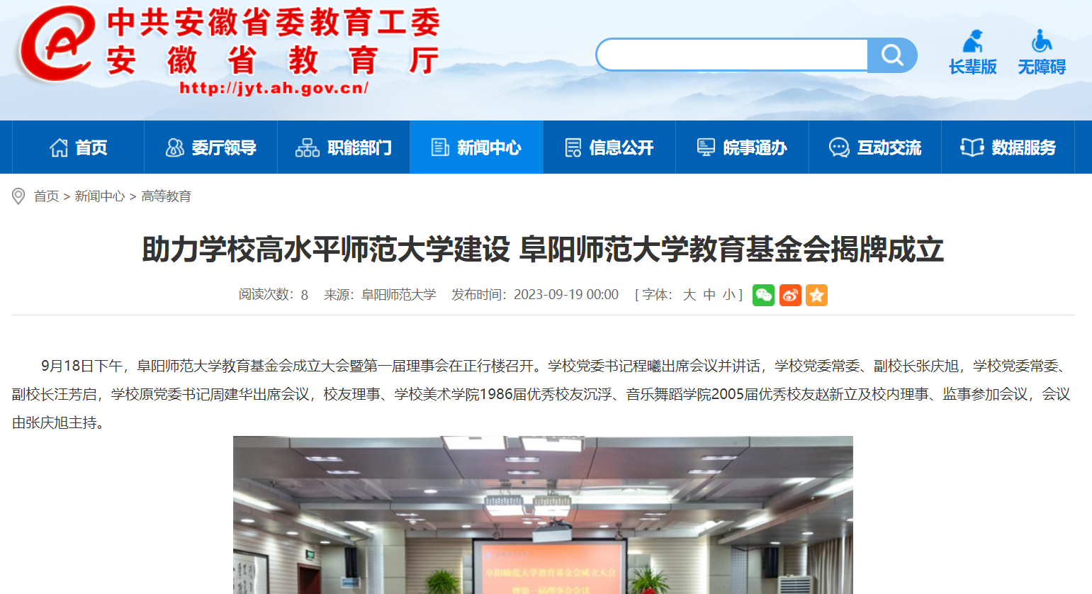 9月19日,安徽教育网报道:助力学校高水平师范大学建设 阜阳师范大学教育基金会揭牌成立。文章地址: