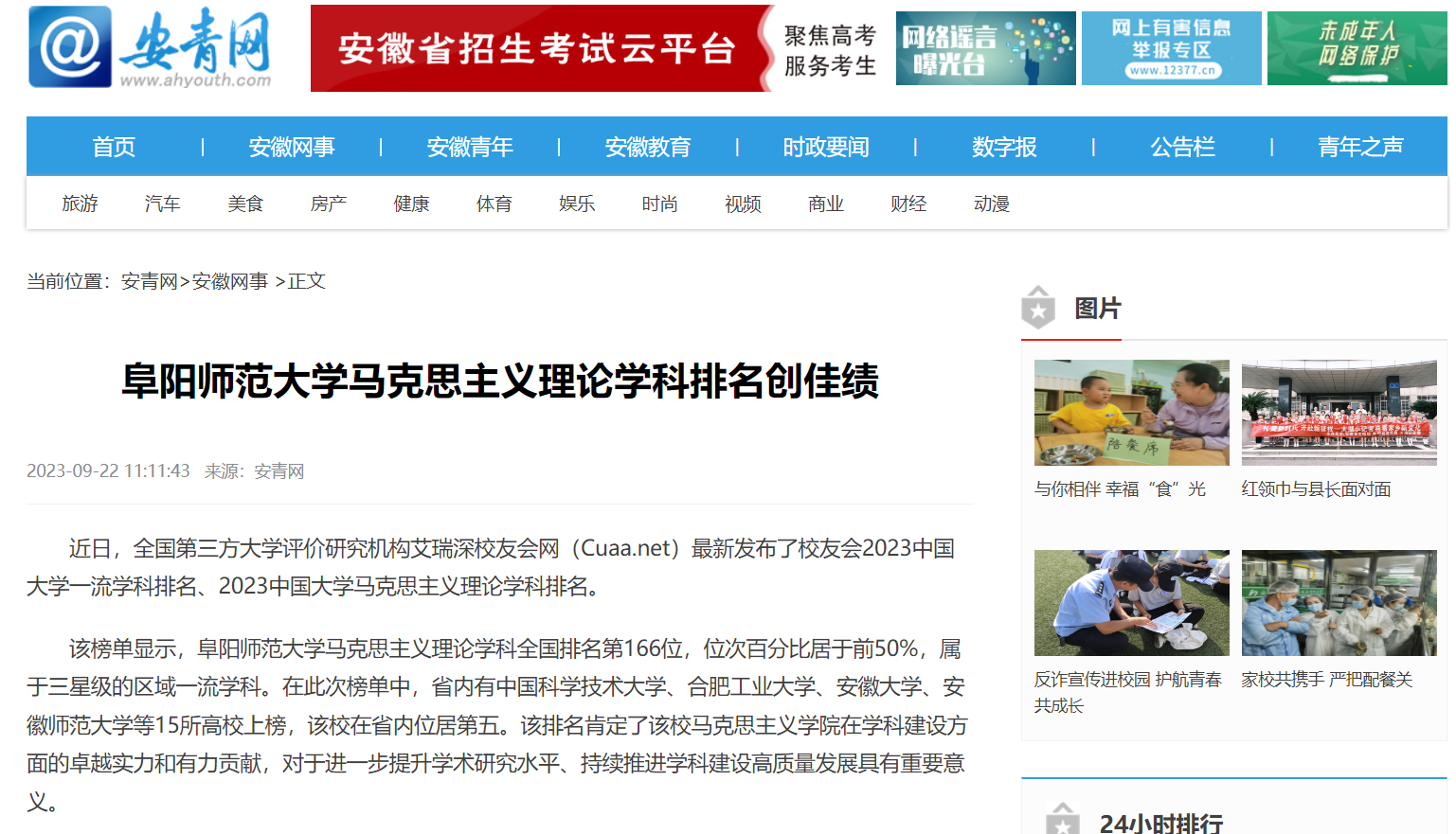 9月22日,安青网报道:阜阳师范大学马克思主义理论学科排名创佳绩。文章地址: