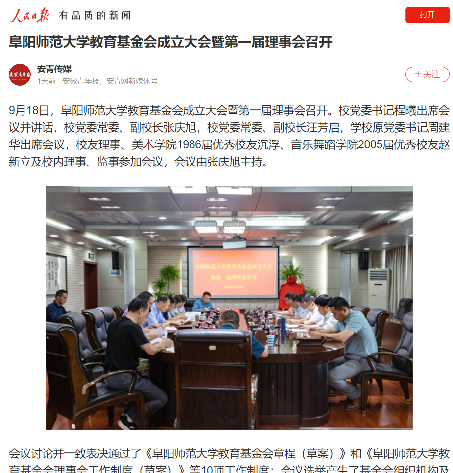 9月22日,人民日报报道:阜阳师范大学教育基金会成立大会暨第一届理事会召开。文章地址:https://wap.peopleapp.com/article/rmh37917507/rmh37917507