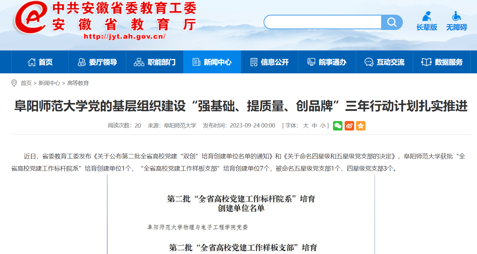 9月24日,安徽教育网报道:阜阳师范大学党的基层组织建设“强基础、提质量、创品牌”三年行动计划扎实推进。文章地址:http://jyt.ah.gov.cn/xwzx/gdjy/40672658.html