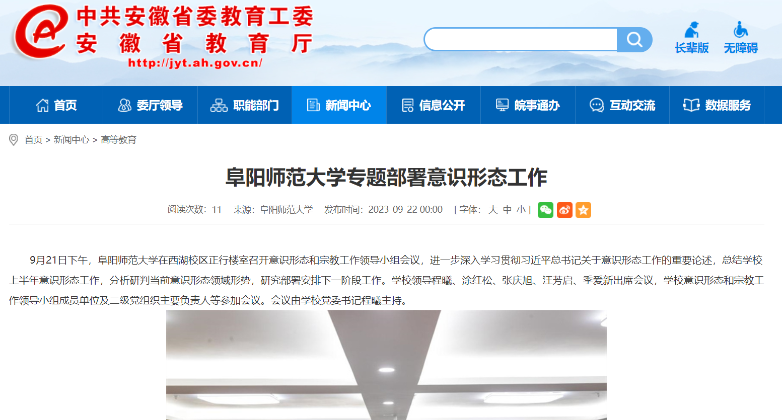 9月22日,安徽教育网报道:阜阳师范大学专题部署意识形态工作。文章地址: