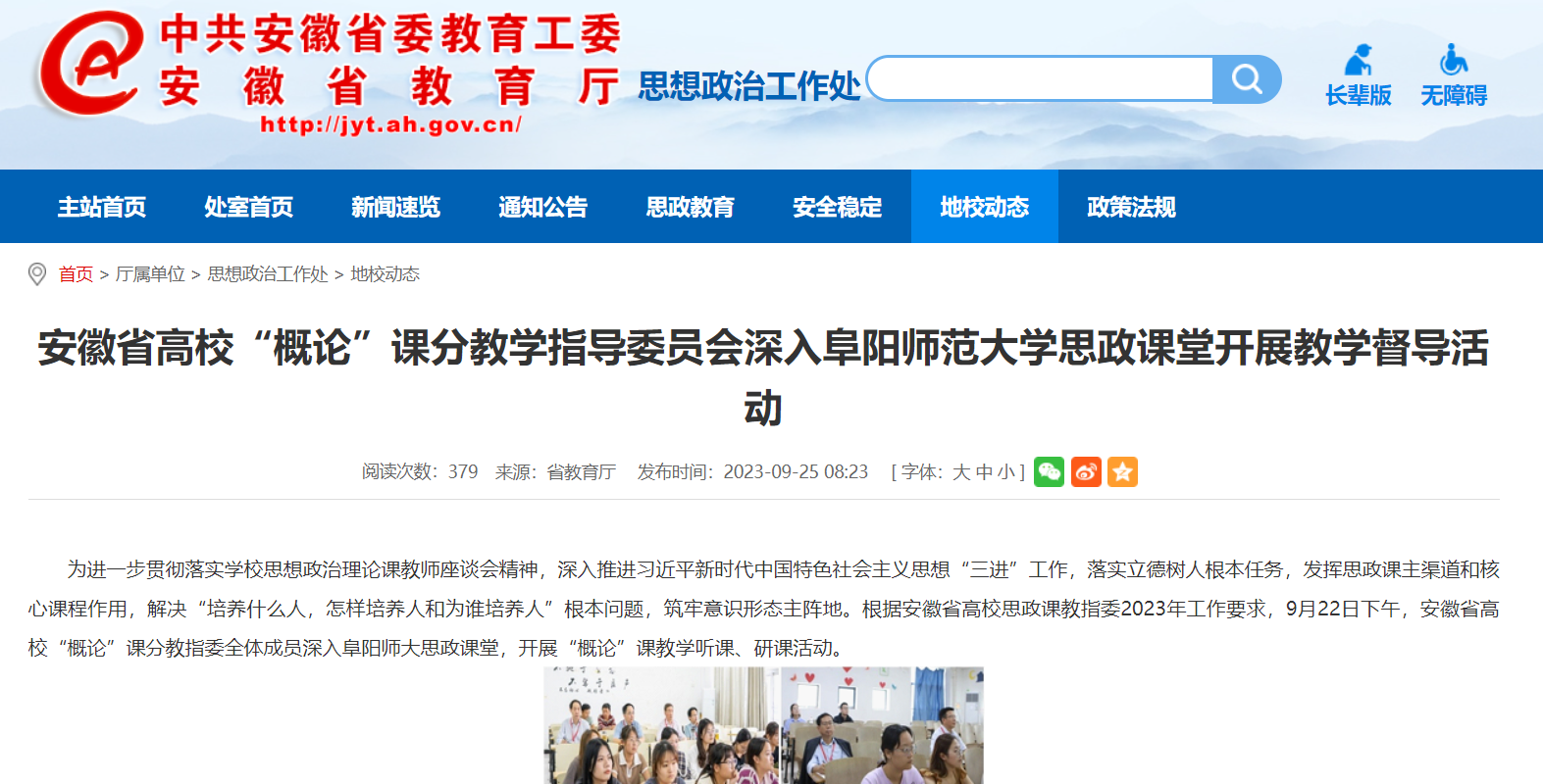 9月25日,安徽教育网报道:安徽省高校“概论”课分教学指导委员会深入阜阳师范大学思政课堂开展教学督导活动。文章地址:http://jyt.ah.gov.cn/sxzzgzc/dxdt/40672687.html