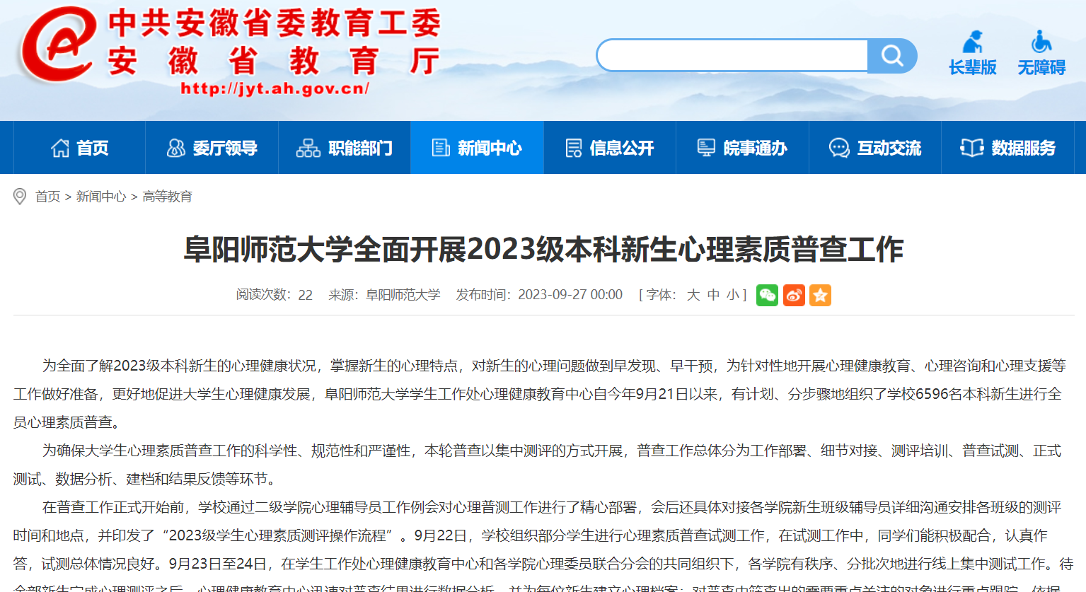 9月27日,安徽教育网报道:阜阳师范大学全面开展2023级本科新生心理素质普查工作。文章地址: