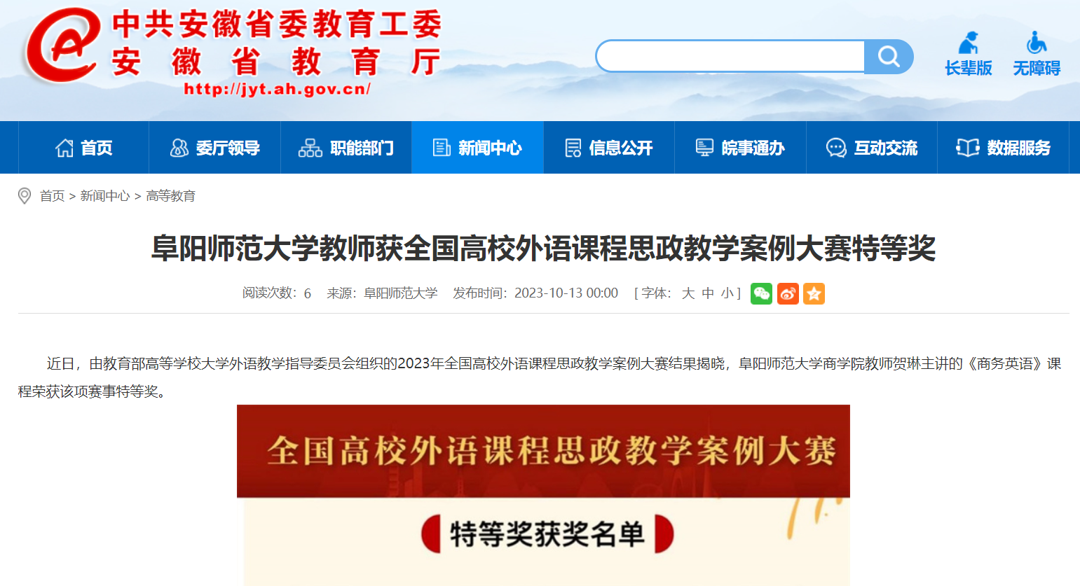 10月13日,安徽教育网报道:阜阳师范大学教师获全国高校外语课程思政教学案例大赛特等奖。文章地址:
