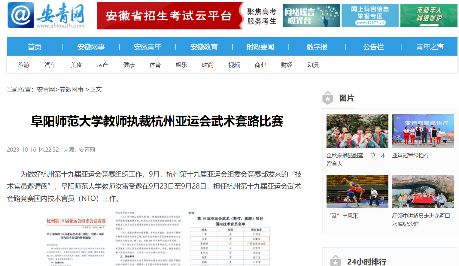 10月16日,安青网报道:阜阳师范大学教师执裁杭州亚运会武术套路比赛。文章地址: