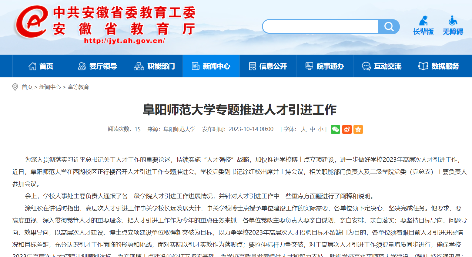 10月14日,安徽教育网报道:阜阳师范大学专题推进人才引进工作。文章地址: