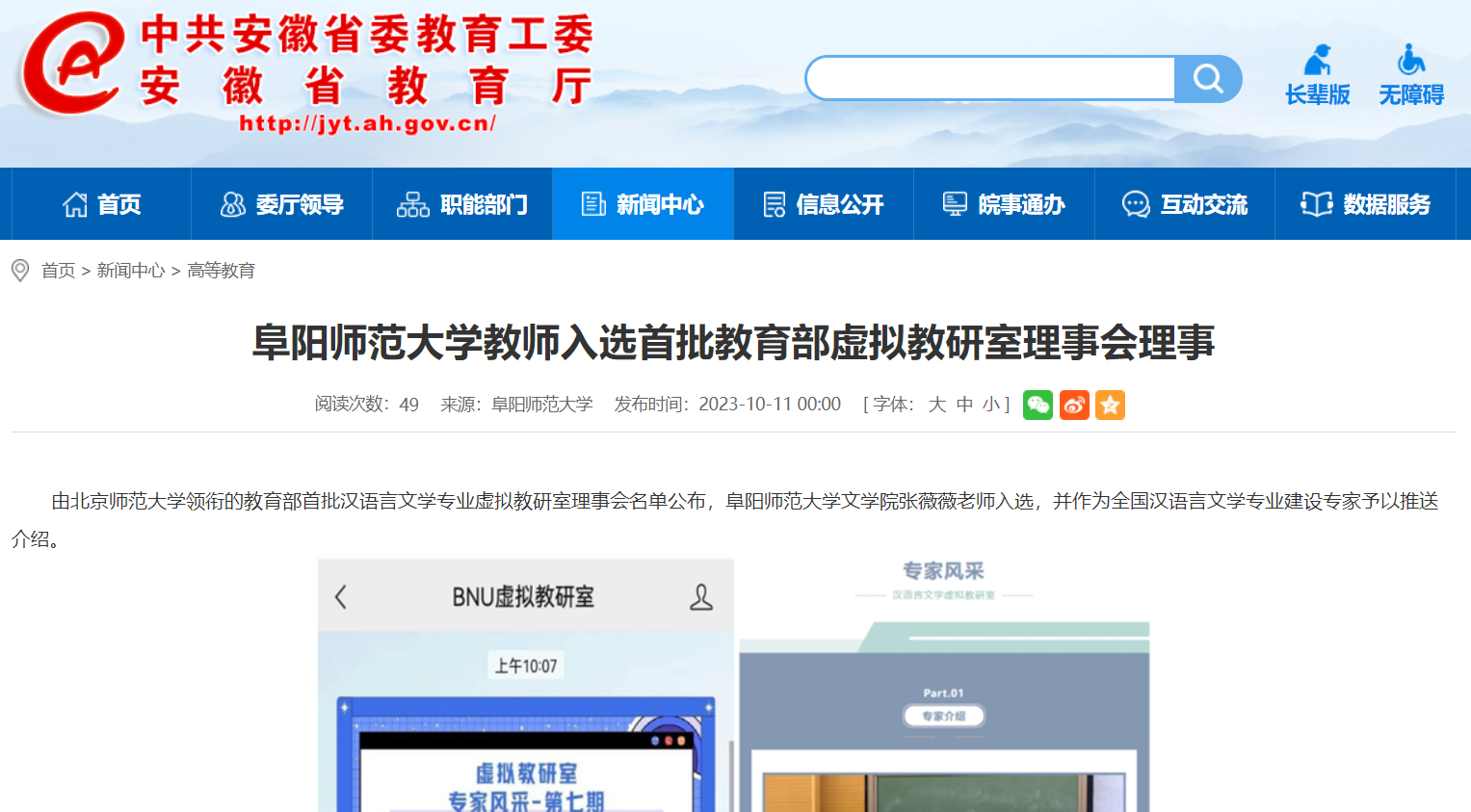 10月11日,安徽教育网报道:阜阳师范大学教师入选首批教育部虚拟教研室理事会理事。文章地址: