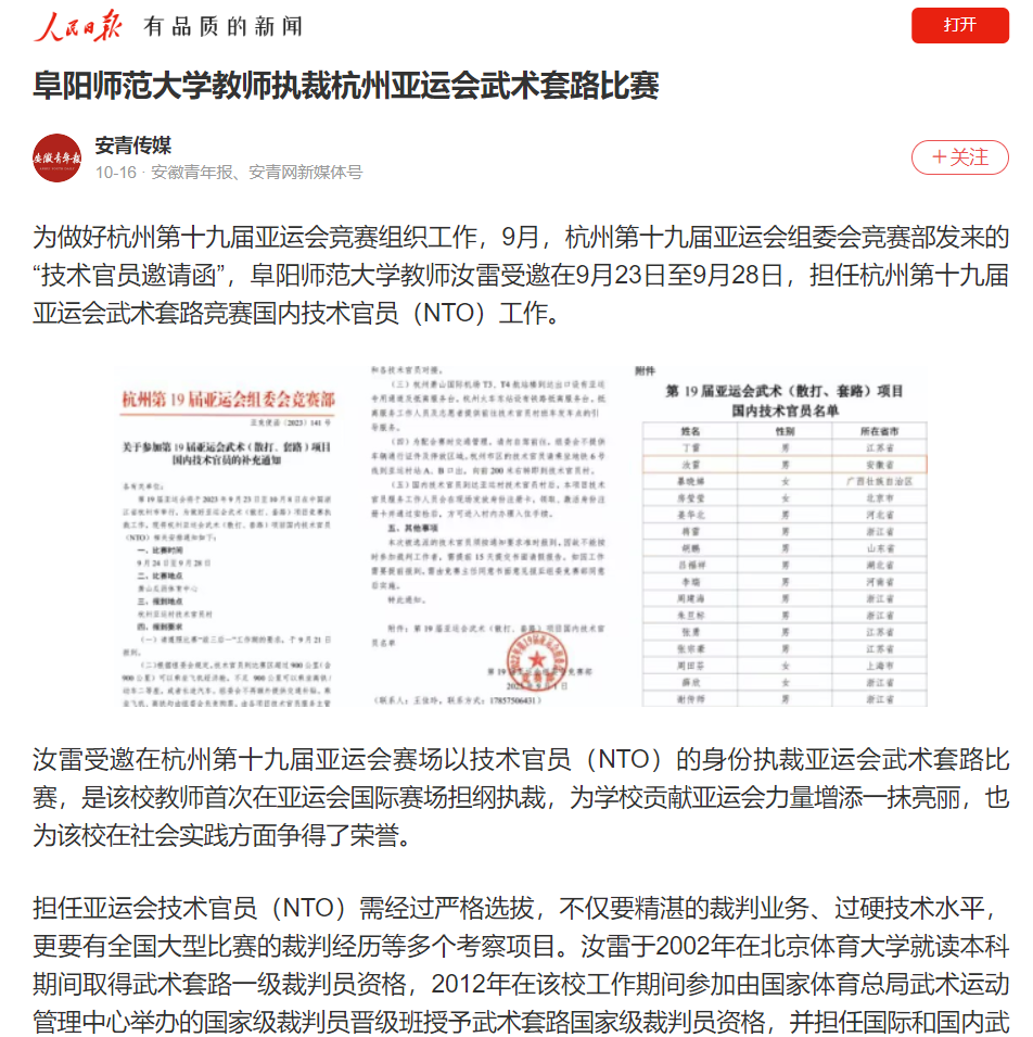 10月16日,人民日报客户端报道:阜阳师范大学教师执裁杭州亚运会武术套路比赛。文章地址:https://wap.peopleapp.com/article/rmh38228285/rmh38228285