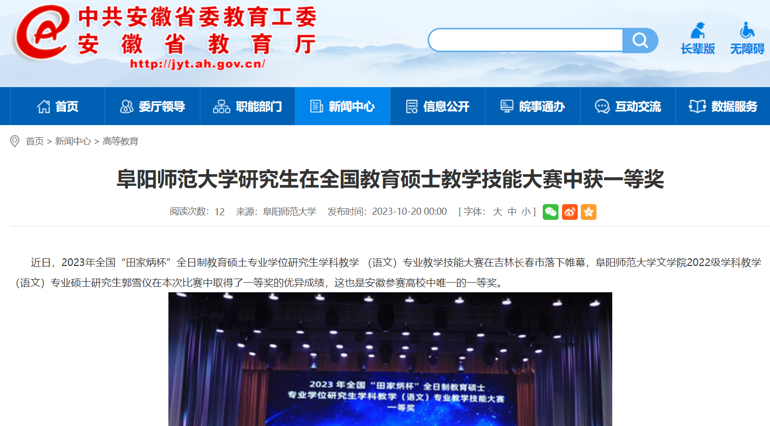 10月20日,安徽教育网报道:阜阳师范大学研究生在全国教育硕士教学技能大赛中获一等奖。文章地址: