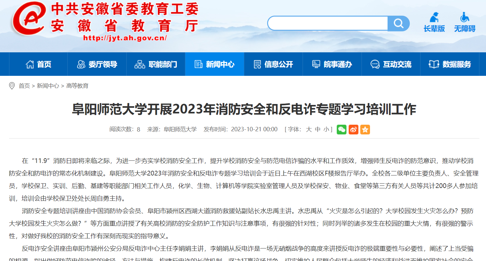 10月21日,安徽教育网报道:阜阳师范大学开展2023年消防安全和反电诈专题学习培训工作。文章地址: