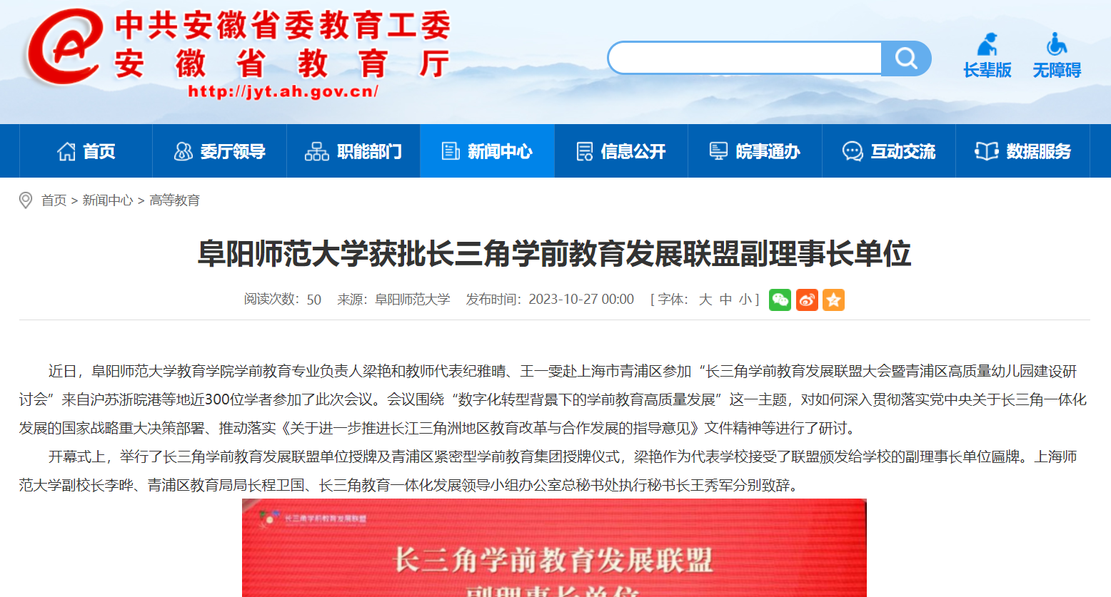10月27日,安徽教育网报道:阜阳师范大学获批长三角学前教育发展联盟副理事长单位。文章地址: