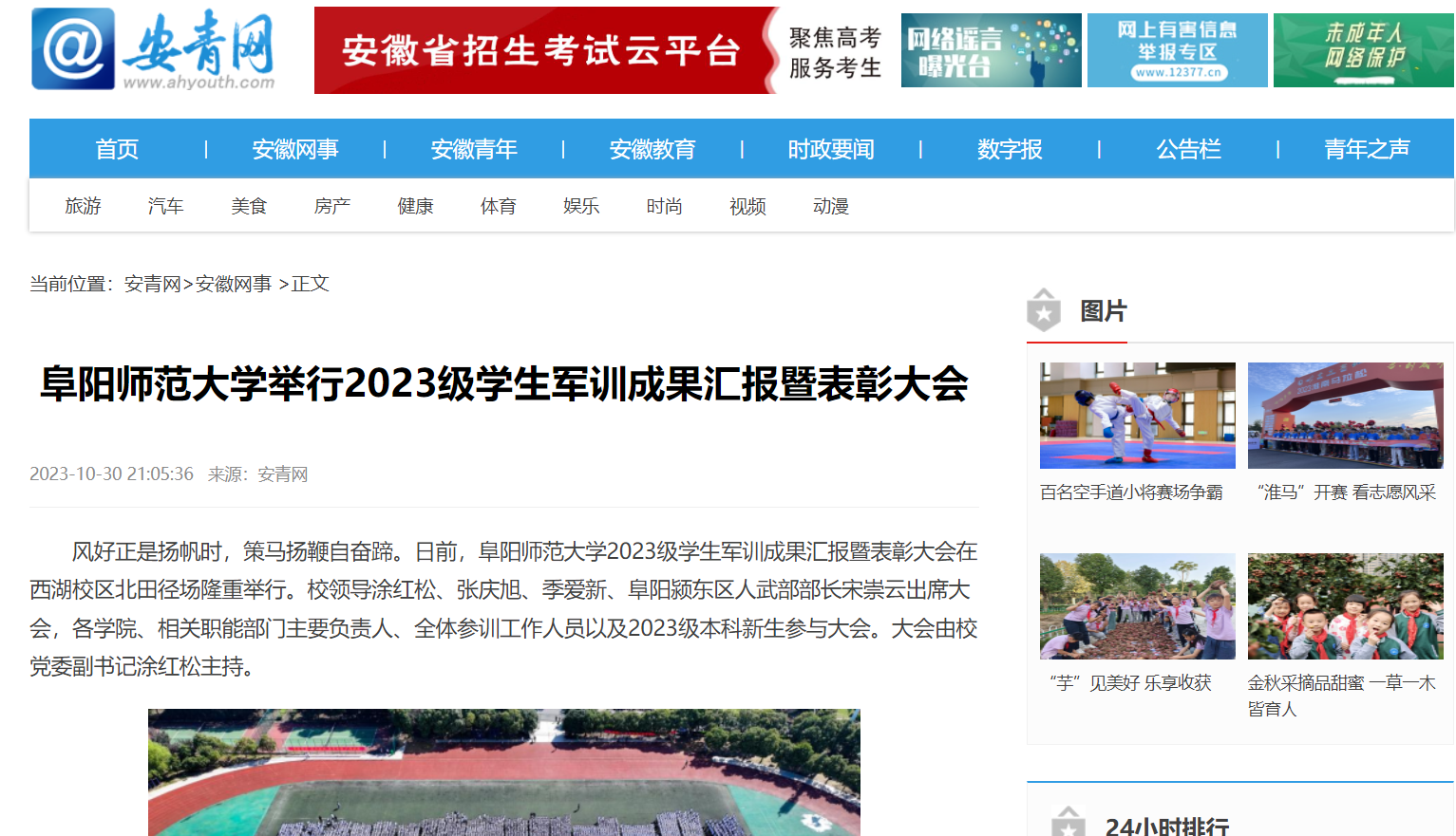 10月30日,安青网报道:阜阳师范大学举行2023级学生军训成果汇报暨表彰大会。文章地址: