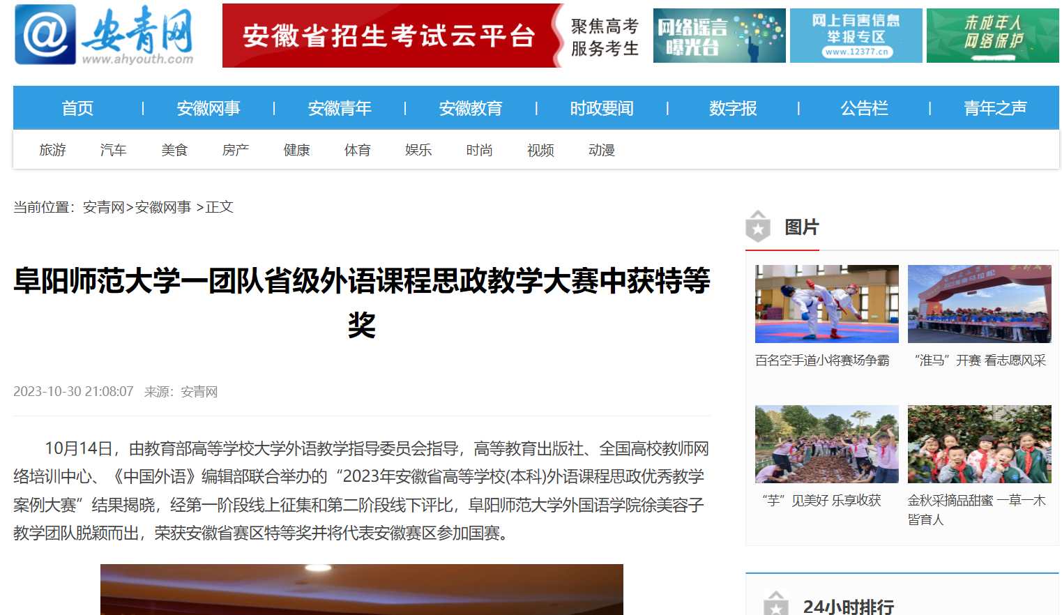 10月30日,安青网报道:阜阳师范大学一团队省级外语课程思政教学大赛中获特等奖。文章地址: