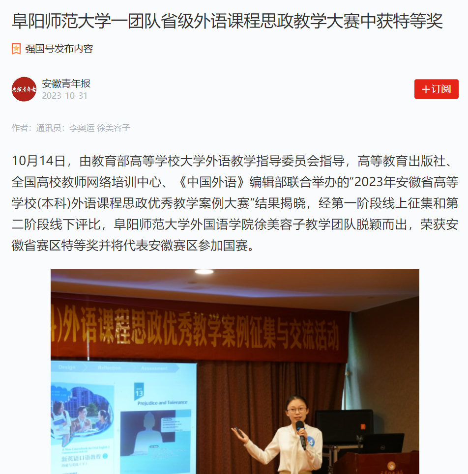 10月31日,“学习强国”安徽青年报平台报道:阜阳师范大学一团队省级外语课程思政教学大赛中获特等奖。文章地址:https://article.xuexi.cn/articles/index.html?art_id=16698162362706483379&source=share&study_style_id=feeds_opaque&reco_id=102655269225c0a8857e000m&share_to=wx_single&study_share_enable=1&study_comment_disable=0&ptype=0&item_id=16698162362706483379