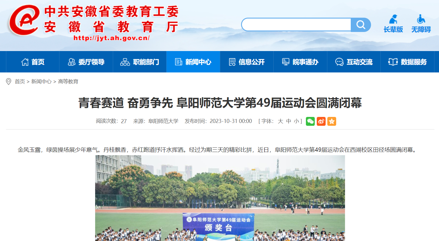 10月31日,安徽教育网报道:青春赛道 奋勇争先 阜阳师范大学第49届运动会圆满闭幕。文章地址: