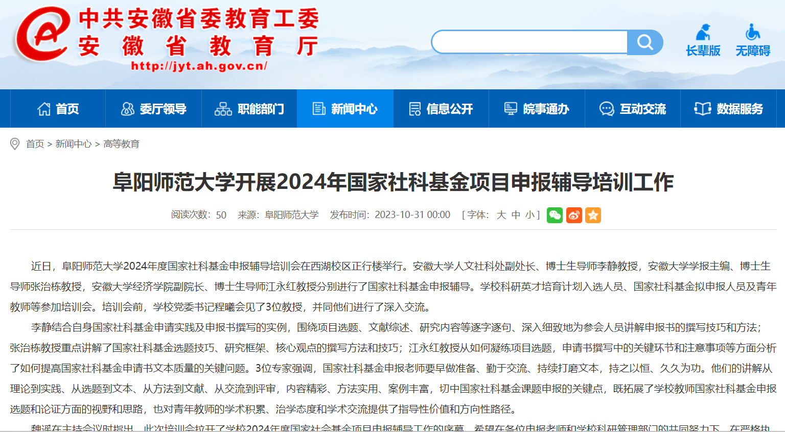 10月31日,安徽教育网报道:阜阳师范大学开展2024年国家社科基金项目申报辅导培训工作。文章地址: