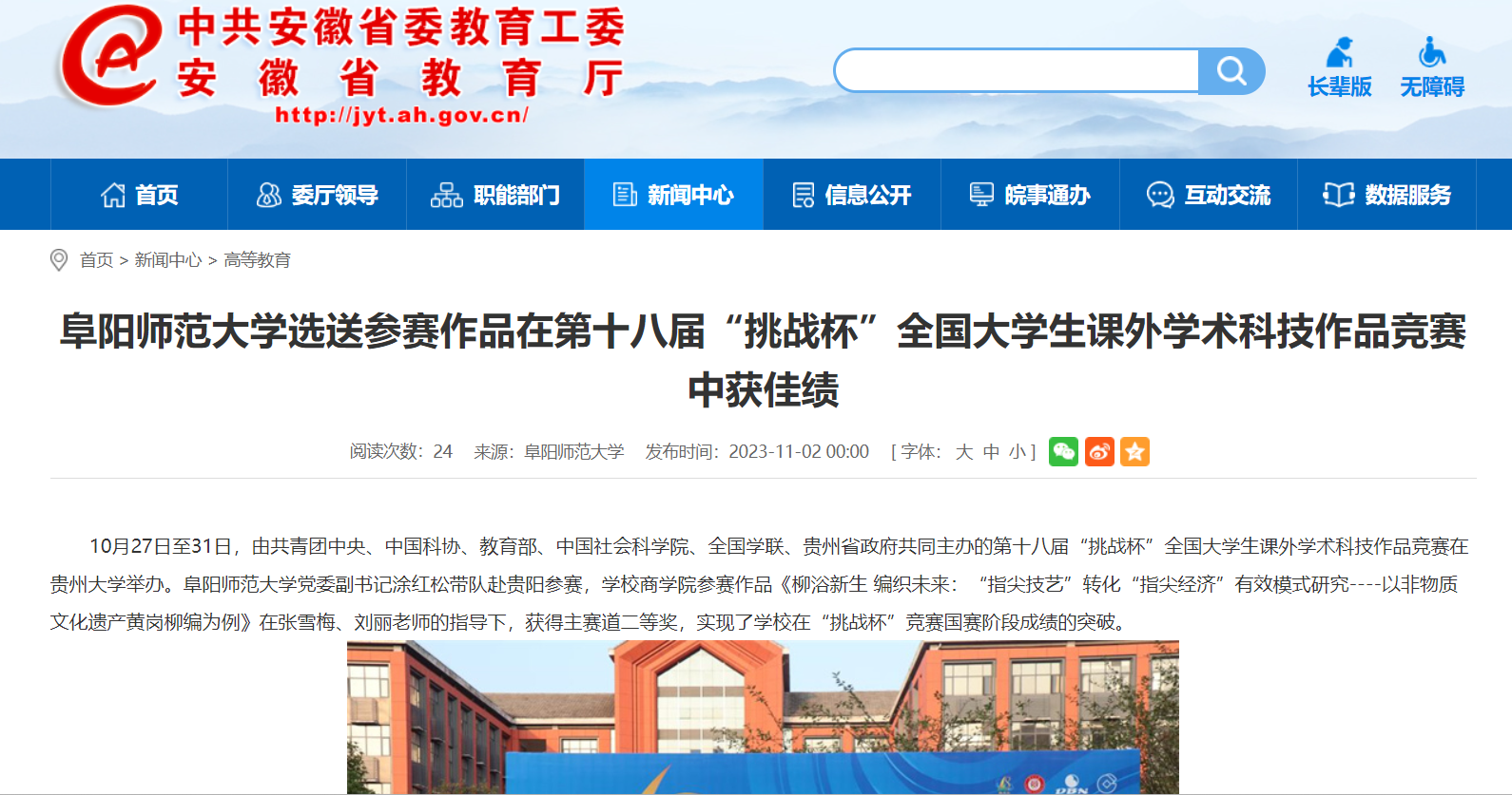 11月02日,安徽教育网报道:阜阳师范大学选送参赛作品在第十八届“挑战杯”全国大学生课外学术科技作品竞赛中获佳绩。文章地址:http://jyt.ah.gov.cn/xwzx/gdjy/40678234.html