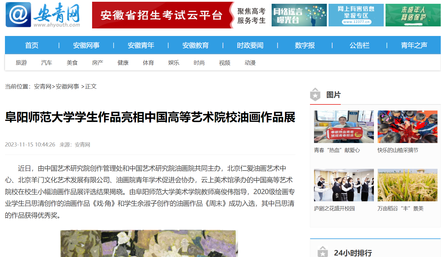 11月15日,安青网报道:阜阳师范大学学生作品亮相中国高等艺术院校油画作品展。文章地址: