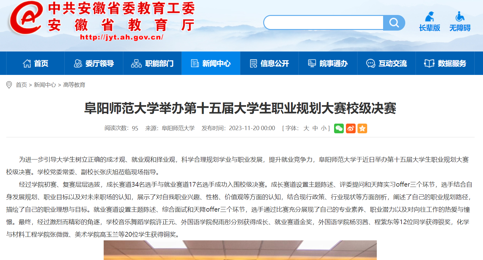 11月20日,安徽教育网报道:阜阳师范大学举办第十五届大学生职业规划大赛校级决赛。文章地址: