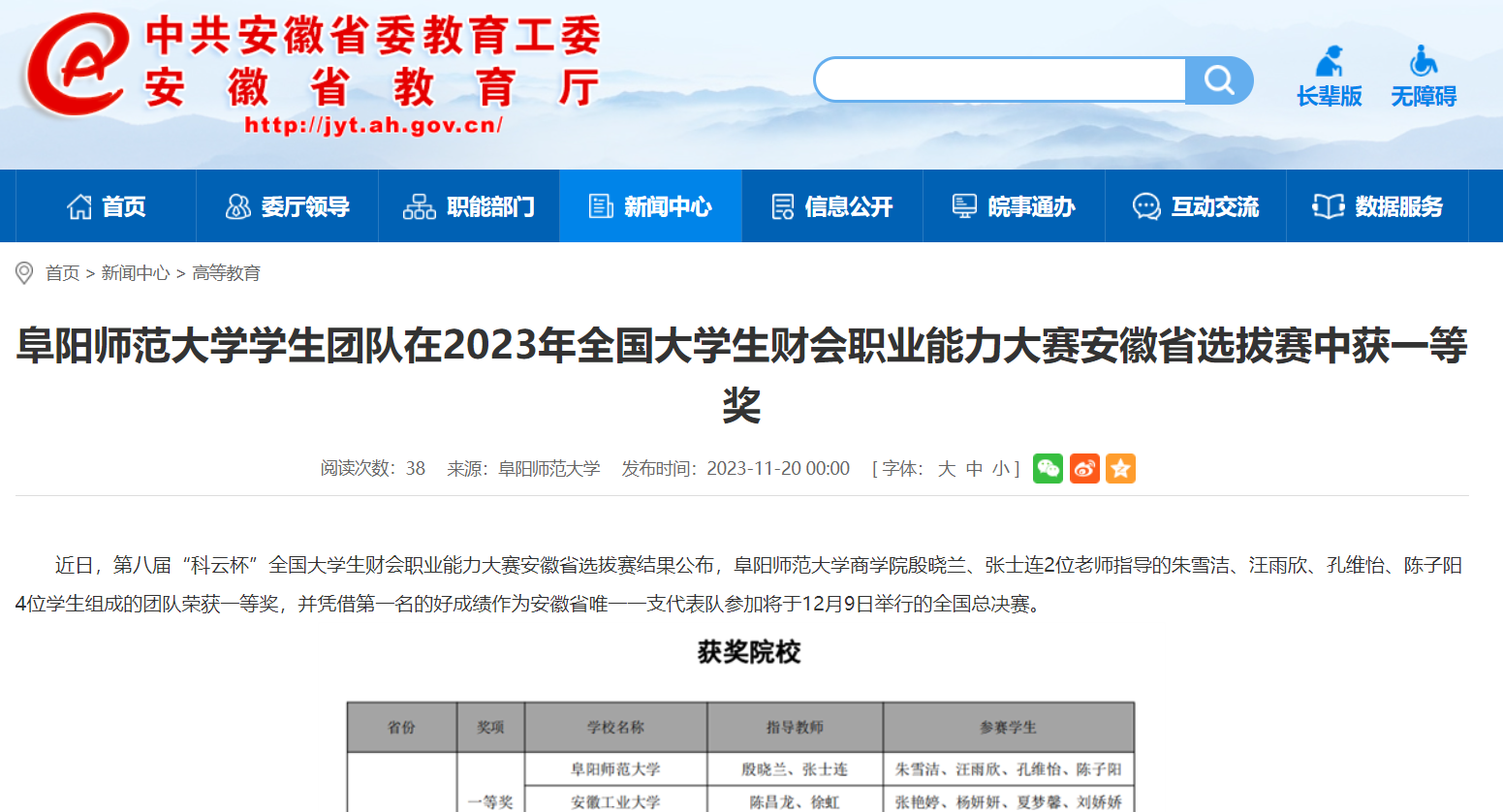 11月20日,安徽教育网报道:阜阳师范大学学生团队在2023年全国大学生财会职业能力大赛安徽省选拔赛中获一等奖。文章地址:http://jyt.ah.gov.cn/xwzx/gdjy/40680692.html