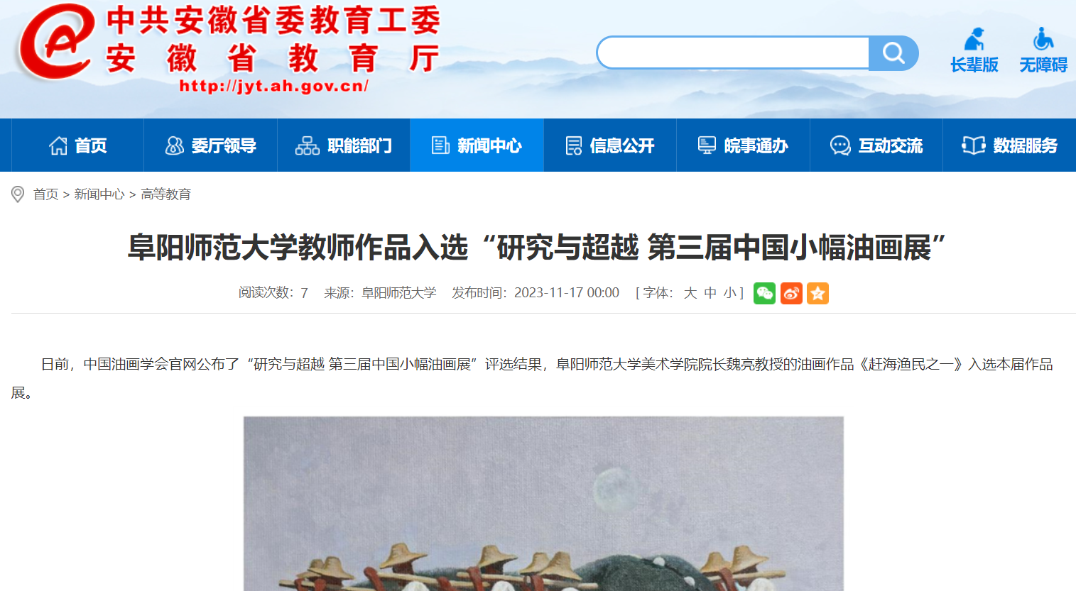 11月17日,安徽教育网报道:阜阳师范大学教师作品入选“研究与超越 第三届中国小幅油画展”。文章地址: