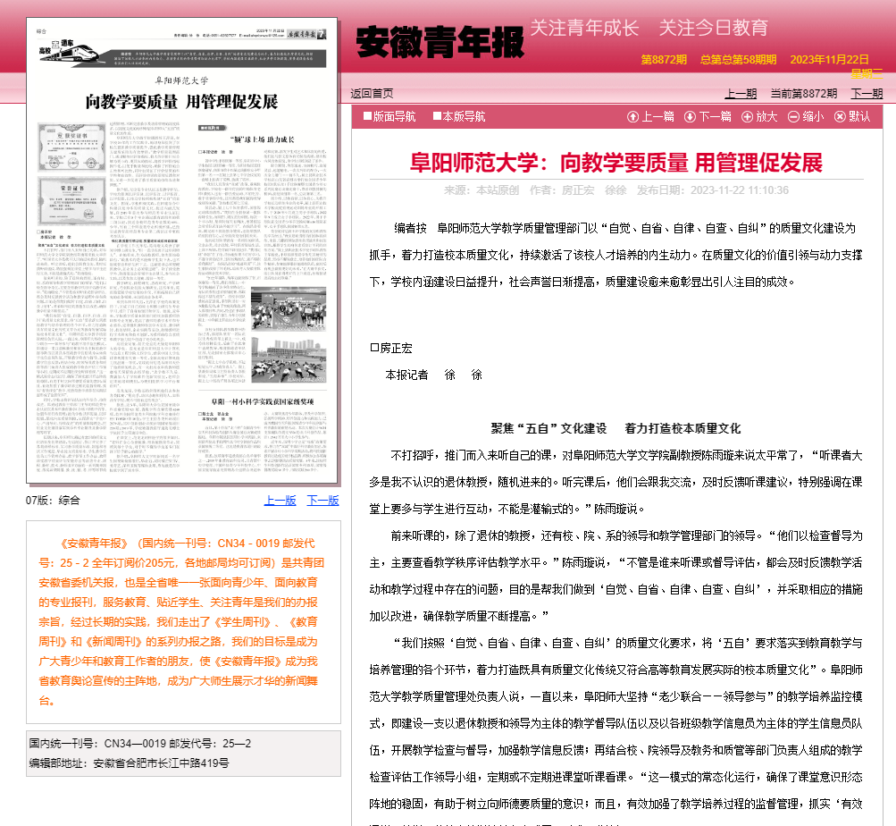 11月22日,安徽青年报报道:阜阳师范大学:向教学要质量 用管理促发展。文章地址:http://epaper.ahyouth.com/paperdetails.php?CurrPeid=2288&CurrSid=22019&newsid=63304