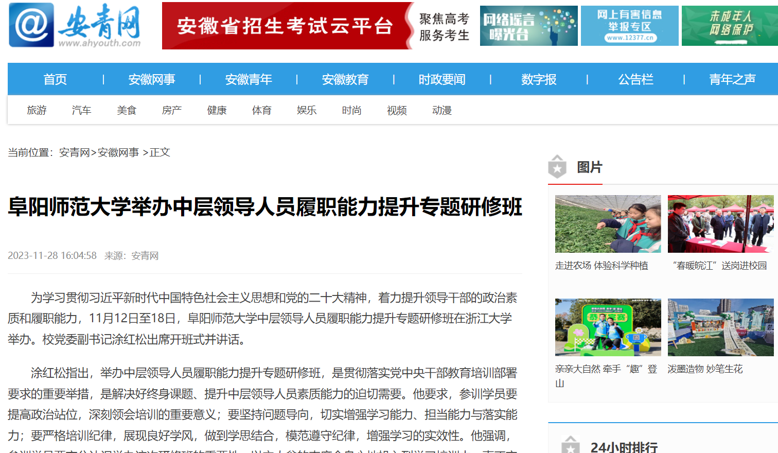 11月28日,安青网报道:阜阳师范大学举办中层领导人员履职能力提升专题研修班。文章地址: