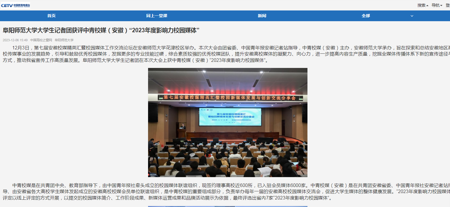 中国教育电视台官网报道:阜阳师范大学大学生记者团获评中青校媒(安徽)“2023年度影响力校园媒体”