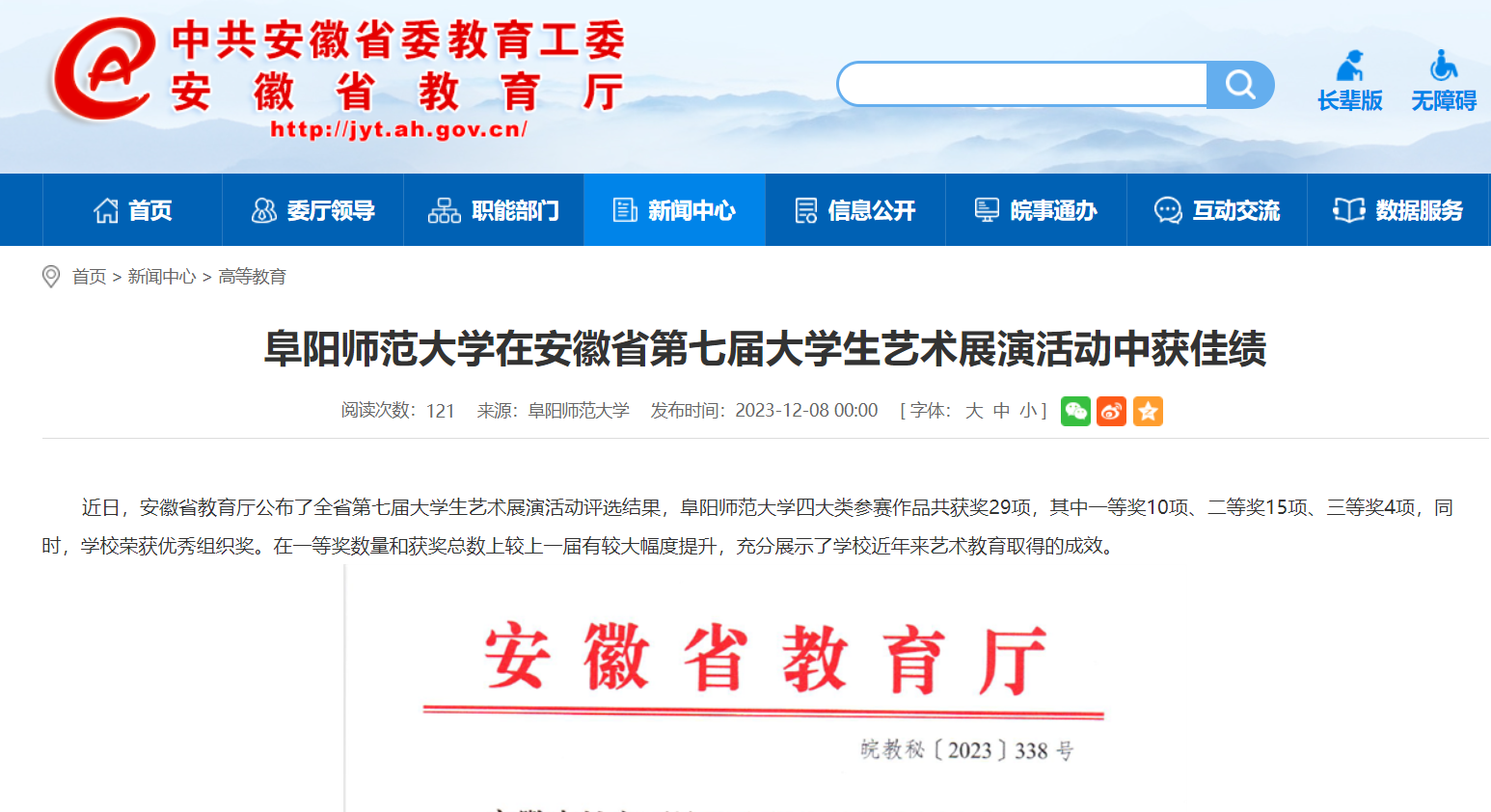 12月08日,安徽教育网报道:阜阳师范大学在安徽省第七届大学生艺术展演活动中获佳绩。文章地址: