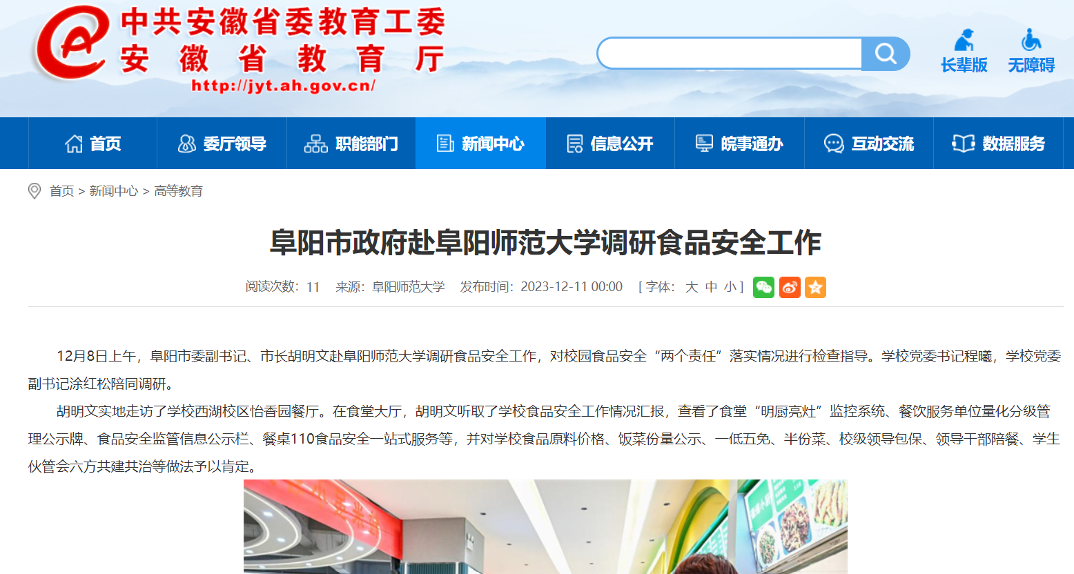 12月11日,安徽教育网报道:阜阳市政府赴阜阳师范大学调研食品安全工作。文章地址: