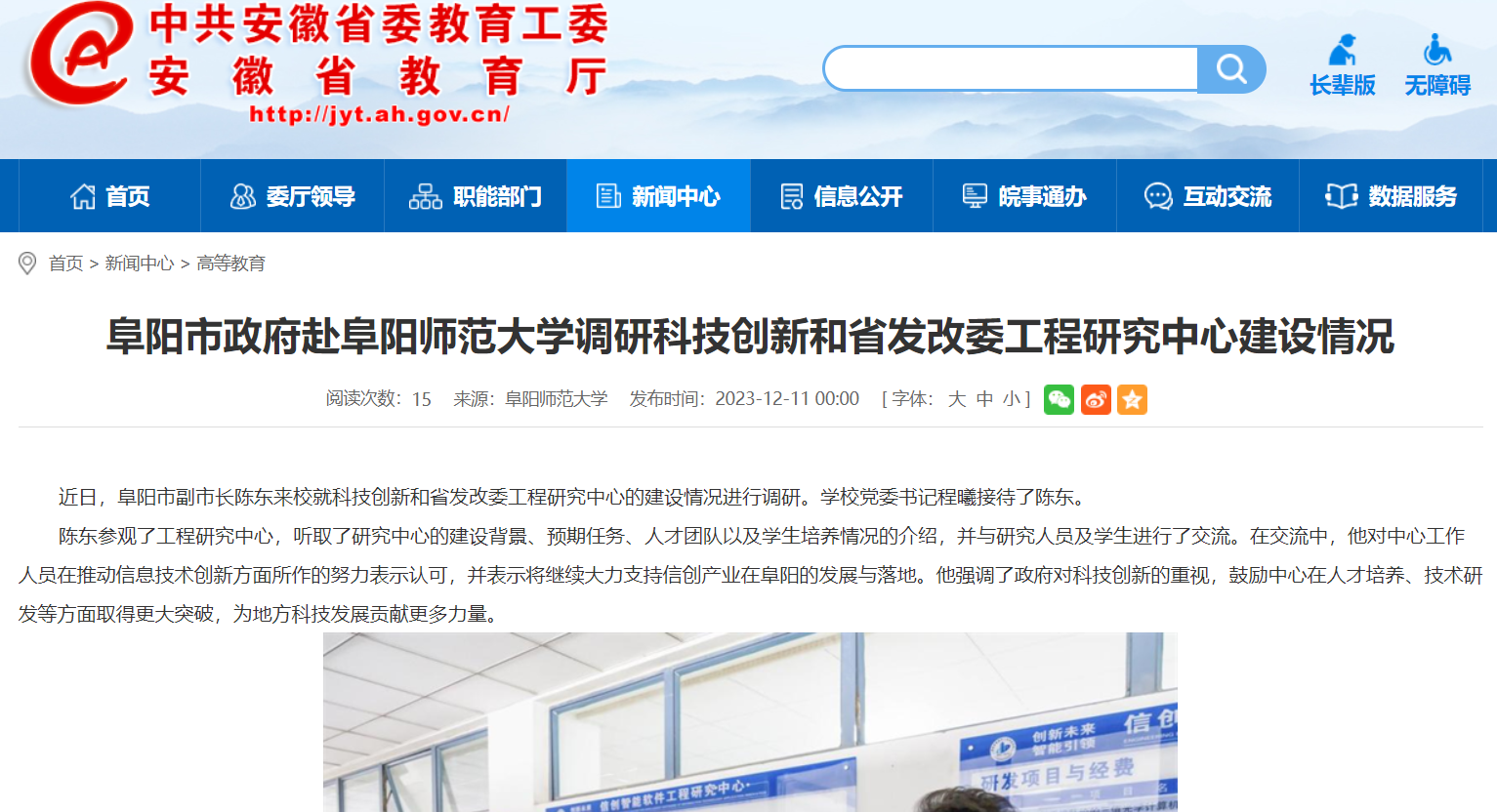12月11日,安徽教育网报道:阜阳市政府赴阜阳师范大学调研科技创新和省发改委工程研究中心建设情况。文章地址: