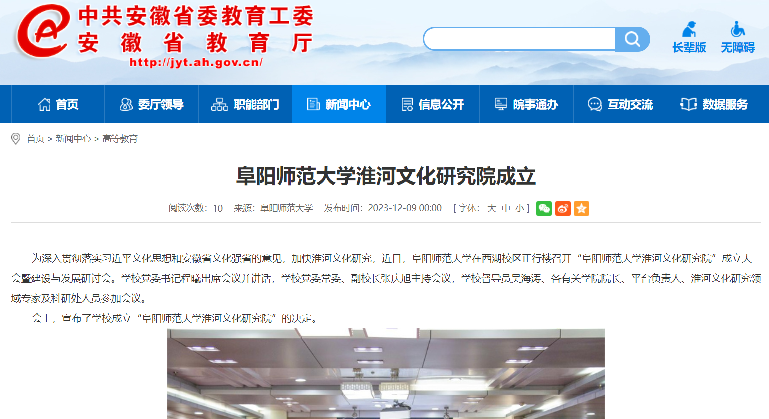 12月09日,安徽教育网报道:阜阳师范大学淮河文化研究院成立。文章地址: